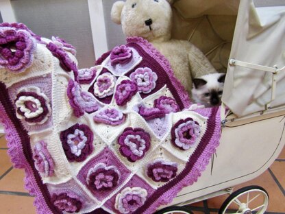 This cot blanket is made from rose centred crocheted squares. Choose a range of toning colours for a lovely shaded look. This blanket is crocheted in 8 ply but is super warm due to the three dimensional shape of the squares. Be prepared to have a bit of patience when making the squares as they do take a bit of time but the overall result is really worth it. I would love a rose garden but this is the closest I am going to get to one at the moment. Add extra squares to make the blanket larger but bear in mind you will need additional yarn. It is a good idea to use all the same brand of yarn for this project as different brands of 8 ply can be a bit thinner or thicker and will result is your squares not being the same size. The size in the photo fits a cradle or pram cover.
