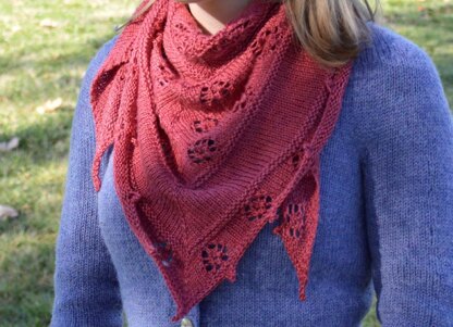Inspired by the pretty miniature roses in bloom around my birthday, this easy triangular shawl features pretty rose motifs and stockinette sections, divided by garter stitch bands. The shawl is a medium-sized shawl, perfect for wearing around the front in a kerchief fashion.