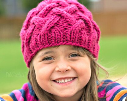 Inspired by the bright pink flowers of the Beach Rose, this cabled beanie is knit in the round and covered with intertwining cables. Bulky weight yarn and large needles makes it a quick knit - perfect for last minute gifts!