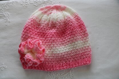 Pattern is written in English. Easy to follow,it includes step-by-step directions. Establish stitch is easy to make. The hat is hand-knitted with self-striping yarn, which has a pretty combination of three colors. it is very soft & light. Decorated with a flower (knitted), 3 sizes. Nice gift for girls.