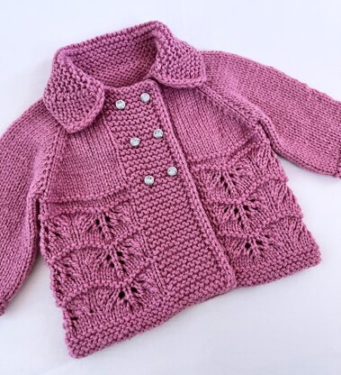 This adorable baby cardigan is worked seamlessly from the top down with classic raglan shaping for a comfortable fit. The body is knitted flat, and the sleeves are worked in the round for a polished finish. It features a neat collar, a wide shaped button band with six buttons, and a charming, easy-to-memorise lace pattern that adds delicate texture while remaining relaxing to knit.