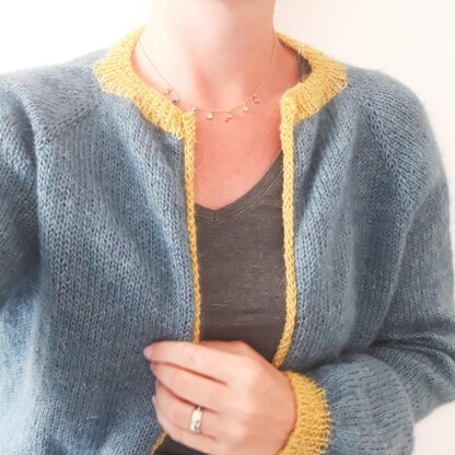 The Rosemary cardigan is a very simple pattern which is worked top-down, starting at the neckline and constructed downwards with raglan increases. At the height of the armhole, body and sleeves are split and worked separately. The two-colour combination applies simple but fun accents and makes the cardigan stand out from your standard wardrobe. The pattern has been kept very simple specifically to enable new knitters to try their hands and needles at a top-down project. The yarn used in the model is a mix of mohair, nettle fiber, and wool, which results in both a warm and soft cardigan, perfect for chilly summer nights or mid-season wear.