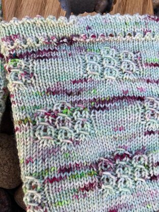Stylized, lace rosette windows with a pretty picot hem. Designed for the March 2021 Sock Knitters Anonymous Architectural Challenge.