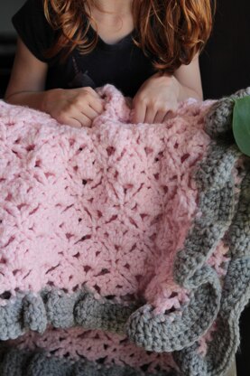 I’ve had this pink in my stash for a while and wanted to create something delicate and lovely with it. Chunky shells and ruffles to the rescue! The overall impression is a diamond shell design. I hope you enjoy this different take on shells!
