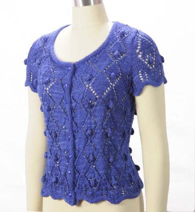 This short sleeve summer cardigan has an all over Diamond Bobble Lace Stitch. The stitch pattern appears in text and chart formats. The sleeve is a classic set in version. The body is worked bottom up in a single piece to the underarms, then divided to work to the shoulders. The edging on the fronts and neckline is picked up on a circular needle and knitted out. Buttonholes are created between the edge of the garment and the band. The sample is knit in a hand dyed wool and silk blend yarn, which creates a fabric with lots of drape. It is shown with 5 cm (2 inches) of positive ease.