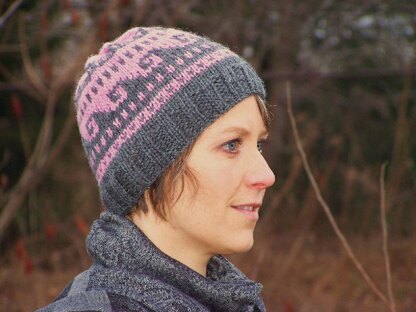 Rosy & Grey was inspired by a cold November morning, where before the sun comes up fully, the world is rendered in shades of gray and rose. Melancholy and Beauty all wrapped up into one! And just like the fog sometimes can float up and swirl down, the pattern swirls on the finished hat!