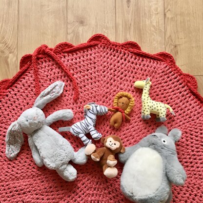 Tidying up toys has never been easier! This fun rug is crocheted in rounds using recycled ribbon yarn, and once playtime is over the i-cord drawstring means you can quickly and easily round up all the toys and store them using the rug as a sack! This pattern is suitable for intermediate crocheters, or the adventurous beginner, and includes a full photo tutorial for how to make crochet i-cord.
