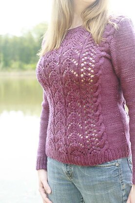 This sweater combines a mix of chunky cables and feminine, easy to work lace on a fitted silhouette. Finished Measurements: Intended to be worn zero to slight positive ease at the bust. Bust: 34 ½ (36 ¼, 38, 40 ¾, 42 ½, 44 ¼, 46, 48 ¾, 50 ½)” / 87.9 (92.4, 96.9, 103.7, 108, 112.7, 117, 124, 128.5) cm. Finished Length: 21 ¾ (22, 22 ¼, 22 ½, 22 ¾, 23, 23 ¼, 23 ½, 23 ¾)” / 54.3 (55, 55.6, 56, 56.8, 57.5, 58, 58.7, 59) cm. Yarn: One Room Fibers Non-Superwash Worsted Merino, 231 yards/100 grams. Shown in Garnet. 4 (5, 5, 5, 5, 6, 6, 6, 6) skeins Or 844 (897, 946, 1000, 1050, 1105, 1155, 1222, 1284) yards / 772 (820, 865, 91, 960, 1010, 1057, 1118, 1174) meters. Needles: US Size 8 / 5 mm., straight or circular, your preference. US Size 8 / 5 mm 16” / 40 cm circular, DPNs or needle preferred for knitting small circumference in the round. Take time to check gauge, and adjust needles if needed. Notions: Stitch markers, tapestry needle, cable needle.
