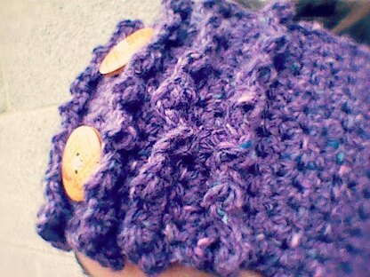 Materials • Berroco Blackstone Tweed (worsted weight; 65% wool, 25% mohair, 10% angora; 1.76 oz/50g; 130 yds/119m per ball): 1 ball plum #2669 • H (5mm) crochet hook • 2 (1-inch) buttons (My buttons were La petite wood buttons that I bought a long time ago at JoAnn Fabrics.)