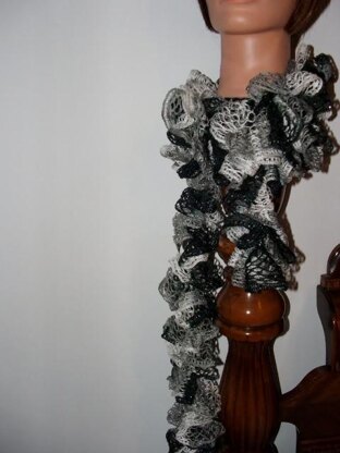 This scarf works up really quick and easy! So easy that a beginner with minimal skills could do it! The results are so very feminine and really pretty. It's a bit of a booger to keep stretching the yarn as you go, but once you get the hang of it, it does get easier and faster.