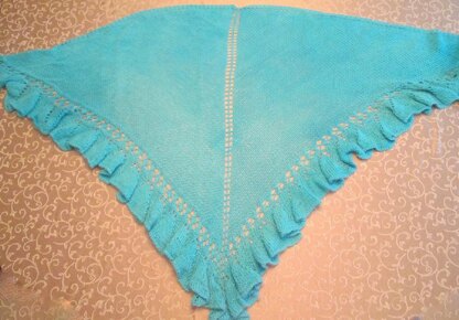 Simple but with a bit of flounce…. a classic stockinette triangular-shaped shawl, with a narrow lace inset at the lower edge followed by a lovely bell ruffle. A lovely but not difficult knit!