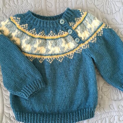 Run Rabbit Run is a Yoked jumper knitted in rows in 4 ply making it an ideal weight for spring, summer, autumn and indoor wear. It is knitted in parts to the armholes where it is joined to form a yoke. It has a neck fastening for ease of dressing and instructions are given for approximate ages 6 months to 6 years. I used Debbie Bliss Rialto 4ply for it’s softness and range of colours.
