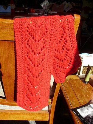 The scarf, which has both a charted and written pattern, features a running hearts pattern up the center framed by eyelet along both sides with a garter stitch edge. It can be worn plain, or have a contrasting color woven through the eyelets.This pattern is a charted lace pattern. Though I did it in Cloud 9, I have also done samples in Lambs Pride Worsted, and I liked the sheen.