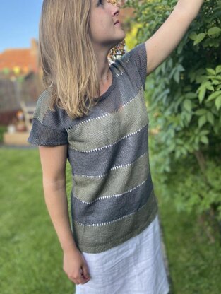 Knitted in the round from the bottom upwards using Midwinter Yarn's gorgeous light fingering weight Lithuanian linen, the shoulders are joined using a 3-needle bind-off and the cap sleeves are then picked-up and knitted downwards to the delicate moss stitch border. The bands of colour are separated with a pretty eyelet detail which enhances the sheerness of the fabric.