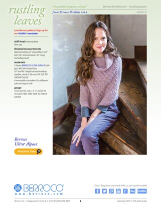 Rustling Leaves Cape in Berroco Ultra Alpaca ist eine Anleitung zum Knitting von Berroco, die als PDF in den folgenden Sprachen verfügbar ist: Englisch. Besonders geeignet ist sie für alle, deren Können bei einzustufen ist. Probiere sie noch heute aus und kreiere dein nächstes Meisterwerk!
