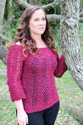 The Sabre Sweater crochet pattern is an off-the-shoulder style sweater that uses a variety of stitches to create it’s gorgeous lacy look!