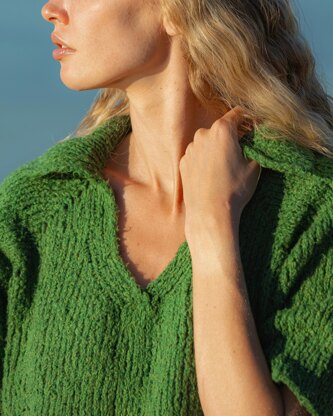 Safari Polo is knit in one piece from the top down seamlessly. It is worked flat, starting with a collar in 1x1 Slip Stitch Rib and continuing with a raglan yoke in stockinette with a ribbed neck trim. After that the work is joined in the round and continuing with the yoke. Once all raglan increases are finished, sleeves are placed on hold and the work continues with main body. Later sleeves are finished top down in the round. Hem and Cuffs are worked in 1x1 Slip Stitch Rib to match the neck trim.