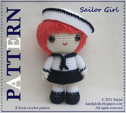 This crochet pattern is written in English using US crochet terms. It is 11 pages long with very detailed instructions and 38 images to help you make this Sailor Girl.