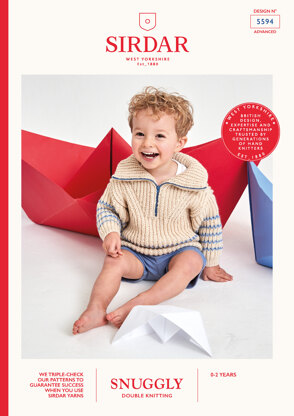 Show off your more advanced knitting skills with this mock fisherman’s rib Sailor Sweater with distinctive, fully-fashioned shaping. Do-up the contrast zip to keep your baby extra cosy when the sea breeze blows then unzip the collar to lie flat when the sun comes out to play.
