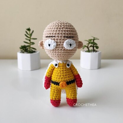 Saitama amigurumi is about 12.5 cm (5 inches) tall. I used small ply balinese cotton yarn (sport yarn) and Tulip hook no. 2/0 (2 mm hook).