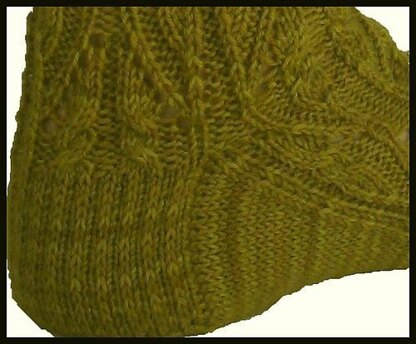 Sake combines simple cables narrowing into hourglass-shaped tracery patterns. The sock is knit from the top down with a slipped stitch heel. Sake is lovely in a variegated yarn, but if you want to highlight the stitch pattern, please consider using a solid, semi-solid or light colored variegated yarn.