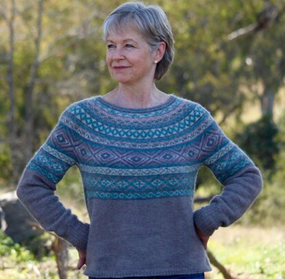 Saligna is a top down sweater, knit entirely in the round. Stranded knitting is used to create the design and only 2 colours are used at any one time. As it is knit from the top down, the length of the sleeves and body are easily adjusted to suit your body.