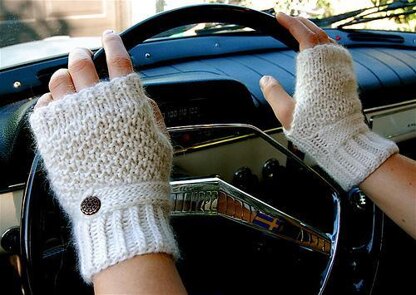 A darling fingerless glove with strap and button, knitted flat and seamed later at the side.
