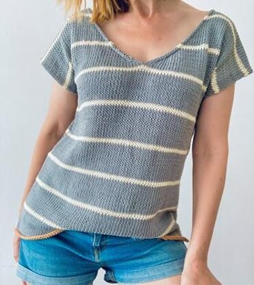 The Saltwaves Tee is a simple, slouchy knitted tee ideal for cooler days at the beach and casual evenings out. Evoking the shimmering grey-blue sea of the English coast in the sheen of mercerised cotton yarn, this tee is knitted flat (in rows) in two pieces from the bottom up. Stitches are cast on for the sleeves and decreases create a wide, flattering V neck. Side vents and a sliver of gold along the hem give the piece a unique twist. Slipped stitches are used at the side vents, sleeve edges (cuffs) and neckline. Pieces are seamed together with mattress stitch at the sides and underarms, with a three-needle bind off for the shoulders.