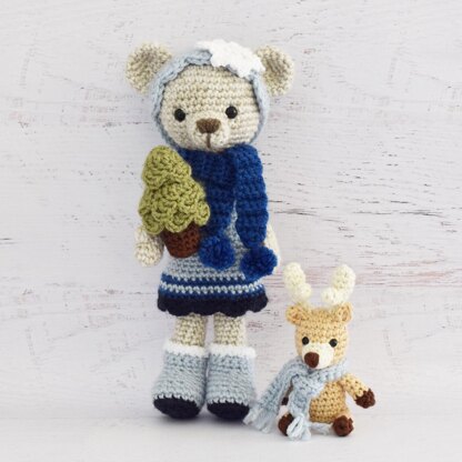 This pattern includes instructions and photos for making the bear doll, ear warmer, scarf, boots, snowflake, reindeer, and tree.