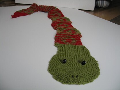 I created this scarf because I wanted to design something using shadow knitting. It is an easy knit and from different angles you get a view of red or green diamonds down the snake's back.