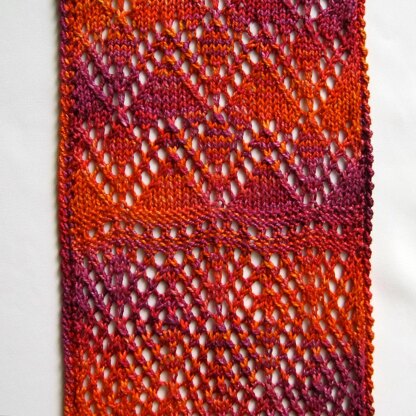 This is a pattern that can be made into a scarf or a stole or a shawl. There is a material list for each, as well as the change in the number of stitches required to complete each pattern. There are three different lace stitches involved, the one shown on both of the “bottom ends”, a transitional lace, and the center lace panel. Further, each of the stitches shows itself off whether knitted in a solid or a variegated colorway.
