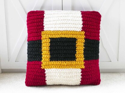 Our Santa belt pillow crochet pillow is the perfect addition to your handmade Christmas home decor. The chunky yarn makes this is a quick project.