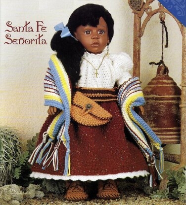 Santa Fe Senorita, #2597. Our little 1824 southwestern miss is ready for a buggy ride into town. Crochet pattern leaflet includes instructions to make her skirt, blouse, sash, pantalets, moccasins, rebozo (shawl) and pouch. Made from an assortment including Luster Sheen, worsted weight and cotton yarns and perle cotton (or substitute #10). Fits 18" American Girl Dolls, Springfield Dolls, Götz Dolls and similar sized dolls. I designed this outfit with the American Girl Josefina doll in mind.
