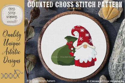 An Adorable Christmas Santa with Gift Sack Gnome counted cross stitch design!\nCross Stitch Pattern designed by Marcia Manning.\nDesign is 120 stitches wide by 110 stitches high.\nPDF is a COLOR counted cross stitch chart which lists suggested DMC floss colors, and includes a color picture.\n\nStitched design size is as follows:\nSize 11 count: 10.91 x 10.00 inches or 27.71 x 25.40 cm\nSize 14 count: 8.57 x 7.86 inches or 21.77 x 19.96 cm\nSize 16 count: 7.50 x 6.88 inches or 19.05 x 17.46 cm\nSize 18 count: 6.67 x 6.11 inches or 16.93 x 15.52 cm\nSize 22 count: 5.45 x 5.00 inches or 13.85 x 12.70 cm
