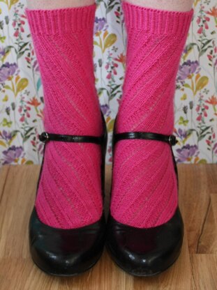 The Sara Elin socks are knitted from the toe up and use a gusset and heel flap construction, shaped with short rows. The socks have a pattern on the instep and around the leg, while the sole is knitted in stocking stitch. The gusset length is affected by your row/round gauge, so a small amount of optional maths is included to achieve the perfect fit.