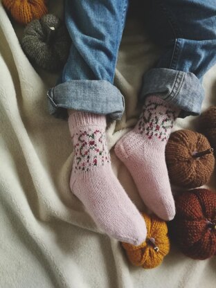 Sara socks future colorwork flower pattern on the leg. You need to pay attention to the colorwork chart, but after that, you knit your plain vanilla sock. Perfect for gift knitting.