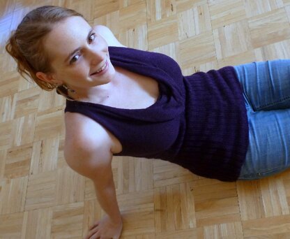 Sarah is a fun piece with a touch of elegance. It is beautiful by itself on warm days, or it can be layered over a long sleeve tshirt and jeans for a modern take on the classic sweater vest, or under a blazer for the workplace or a night out. Sarah is a racerback sleeveless top with a deep and thick cowl neck. It is knit from the bottom up, beginning with ribbing from the mid-hip to the empire waist. Ribbing all the way up to the empire waist allows the fabric to hug curves and create a very flattering fit. Because of the way the cowl is shaped, Sarah easily fits a wide variety of shapes and bust sizes.
