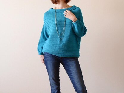 Sazanami - ripples in Japanese - is a comfortable, wide boat-neck pullover with ripple pattern on the body. It is worked from the top down seamlessly. The front and back are first worked in the round to the shoulder point, then back and forth separately to the underarm, where they are joined again. The lower body is knitted in one piece in the round and gently tapered toward the hem. Sleeves stitches are picked up around the arm openings and worked down straight in the round, and the cuffs are puffed with decreases. Finally, stitches are picked up for neckband, which also evocates ripples. All edgings are finished neatly with I-cord.