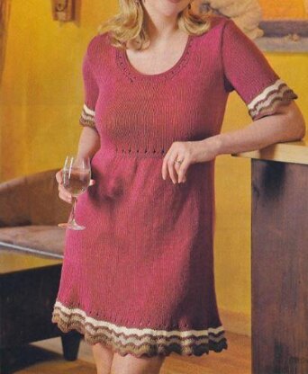 This is a pattern for a scallop edge Dress, originally published in Simply Knitting. It is mainly in stocking stitch with a scallop lace edge on the hem and sleeve edges in contrast colours. It has an eyelet detail at the neck and waist, and is shaped in at the waist. The yarn has now been discontinued, and DK yarn knitting to this standard dk tension can be used. Photo Simply Knitting.