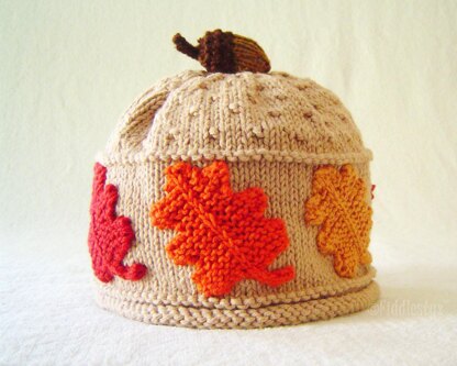Knit in the round in a simple textured stitch, the bright oak leaves are knit separately and sewn on later. A cute acorn tops it off.