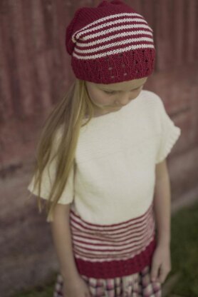 A textured striped top and a matching slouchy hat topped off with a pompom. The top starts with lace rib, then 2x2 stripes, stocking stitch and finished off with garter stitch. The top is knitted in two pieces, with shaped sleeves and a simple boat neck make this a fun and easy knit.