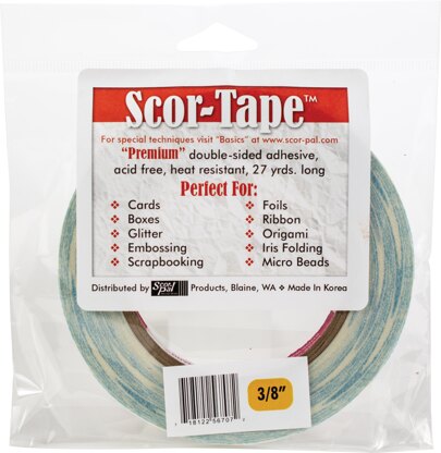 SCOR-PAL:Scor-Tape. Premium double-sided adhesive that is perfect for cards, boxes, glitter, embossing, scrapbooking, foils, ribbon, origami, iris folding, micro beads, and much more! This tape is acid free and heat resistant. Measurements: .375in. x 27 yards. Imported.
