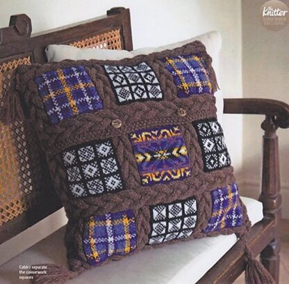 It is hard not to be inspired by the traditional Scottish patterns of Fair Isle, tartan and Sanquhar hence this cushion, showing all three bound together in a celtic plait and finished off with stag’s horn buttons recycled from an old kilt jacket – hence this cushion's alternative name, Monarch of the Glen. Techniques are cabling for the cushion cover and for the squares, which are sewn on to the completed cover, a mixture of stranded knitting and intarsia. The Sanquhar and Fair Isle squares are knitted in the round, separated by steeks, using stranded knitting throughout as only two shades are employed at one time. For the tartan squares, the sample was knitted in the round with steeks, stranding the main shades and working the narrow, vertical stripes as intarsia, but use whichever techniques you prefer. All squares can, of course, be knitted flat, but do include those three sts either side to ensure a neat edge.