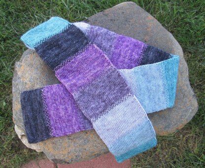 This fingering weight scarf is light-weight & fun to knit. Use several colors of yarn—scraps, or odd-balls, or purposely purchased coordinating sets—to create a striped scarf with small amounts of stranded knitting to help blend the colors into one another.