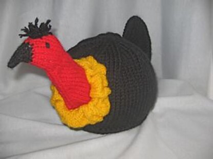 This cosy is unusual – it's tail hides the handle of the pot and the spout is covered by the bird's removable head. Note: you need a teapot with a reasonable length of spout – stubby little spouts won't work with this one.