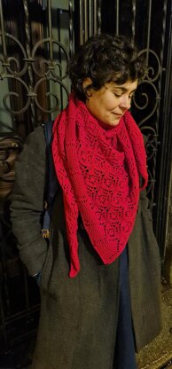 The shawl is an asymmetrical triangle, with a lace pattern all over and with garter stitch ribbing incorporated into the pattern.