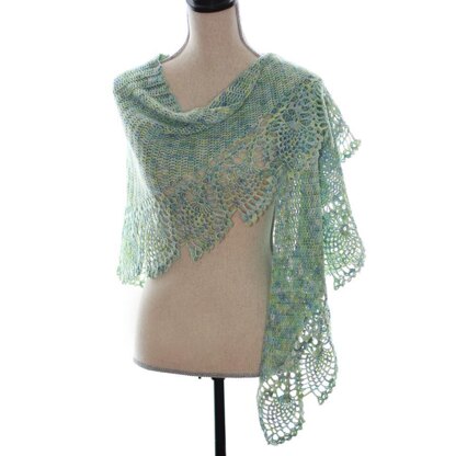 Sea Glass is a light weight, carefree, shawl edged with lacy pineapples that roll and crest just like the waves of the sea.