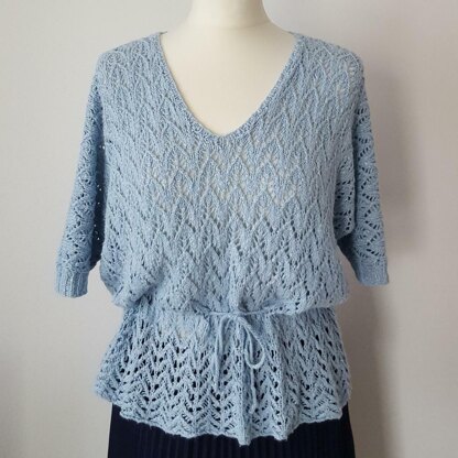 This beautiful summer top has intricate lace chevron patterns, and is designed for a loose and comfortable fit. The blouse can be gathered at the waist with a simple crochet tie belt, and it's reversible so can be worn with the 'V' at the back and the belt tied at the front.