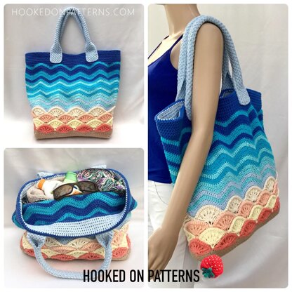 This beach bag crochet pattern is for a large tote bag with a beach themed design. There is plenty of room in the bag to carry a large beach towel, sunscreen/lotions, swimwear, a beach cover/other clothing, and more!