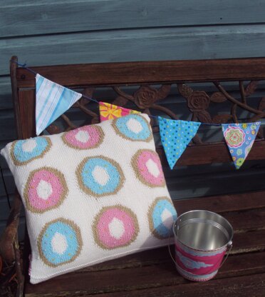 This is a pattern for Doughuts Cushion Cover, part of the Make at Home range of knits for the home. This is inspired by days at the seaside. The yarn is cotton, the main yarn is available on cones, the equivalent number of 50 gm balls are listed. The front is knitted in intarsia, the back in stocking stitch stripes. There are beads added to the doughnut motifs.